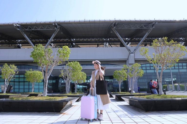 這天拎著粉紅藍雙色行李到高鐵站,因為空箱才3.4公斤,裝了行李也不會太重。