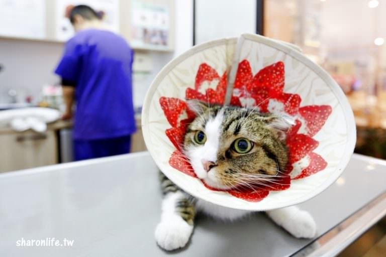 即使是乖貓,抽血還是要戴草莓喇叭花。