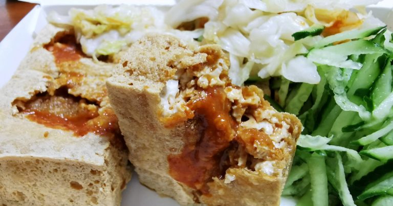 看到臭豆腐裡的孔洞,就知道這肯定是外酥內軟的口感,炸的香酥可口又不會乾的刮口,油瀝的也算乾。但是我覺得醬汁給的好像少了一點,在某些小角落還是能吃到白白的豆腐味,也覺得若蒜味再明顯一點應該會更好,總之在醬汁這塊略有扣分。不過大致說來還是瑕不掩瑜,嘴饞時還是會買來吃。台中好吃臭豆腐其實還有40年老店老吳臭豆腐,泡菜小黃瓜給的都大方。向上市場的有心臭豆腐也很有特色,還有少見的南部臭豆腐呢!還有還有內用紅茶、海帶湯免費喝的花蓮瑞穗臭豆腐,大家最喜歡哪一間呢?