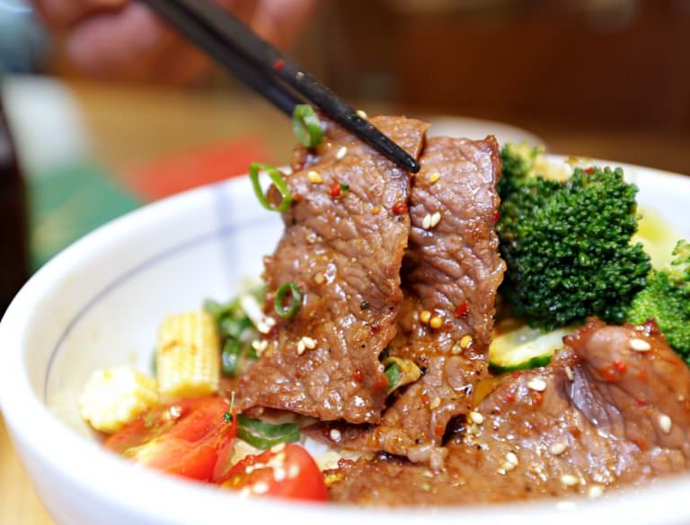 甜豆莢、綠花椰、黃玉米筍、小黃瓜等蔬菜不僅讓餐點看起來更可口,同時也兼顧到營養均衡。再淋上特調醬汁讓一向不太吃米飯的雪倫,幾乎把飯吃光光。建議大家可以用牛肉把米飯、泡菜捲起來一起吃,更能感受泡菜讓牛肉脂香轉化為縈繞齒間的美妙滋味^^
