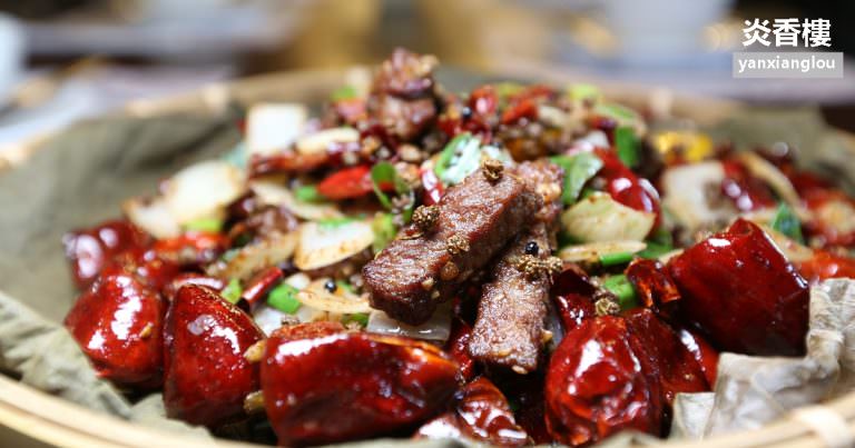 切成骰子狀的去骨牛小排,先乾煎封住肉汁,再爆香洋蔥、青花椒及幾款提香提辣的辣椒後,再放入牛肉大火乾炒。這道菜的好吃度攸關火候,要是炒不久則牛肉還來不及入味;要是炒久了些則牛肉就老了。